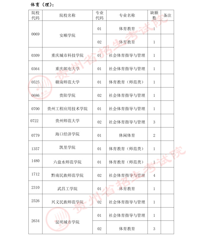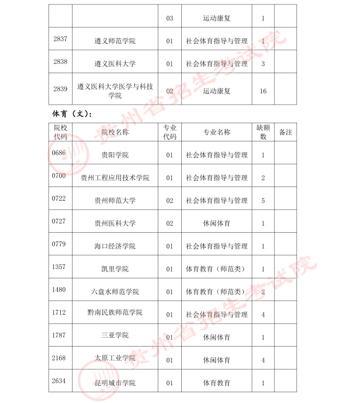 2021贵州高考体育类二本补报志愿计划 时间:2021-07-17 09:43 招生计划 体育类第二批本科院校平行志愿投档后,部分院校仍有缺额。现进行网上补报,考生可根据缺额情况,及时补报志愿。7月16日21:30至7月17日12:00,本次补报设置6个平行志愿。2021贵州高考体育类二本补报志愿计划