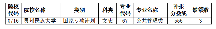 一、文史类国家专项计划报考资格审查合格且分数达到要求的未被录取考生,均可根据附表公布的缺额情况补报志愿,考生补报时请仔细查阅《贵州省2021年高考高校招生专业目录》和院校招生章程了解各院校招生专业的特殊要求。