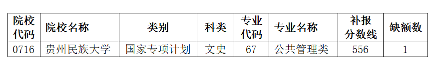 一、文史类国家专项计划报考资格审查合格且分数达到要求的未被录取考生,均可根据附表公布的缺额情况补报志愿,考生补报时请仔细查阅《贵州省2021年高考高校招生专业目录》和院校招生章程了解各院校招生专业的特殊要求。