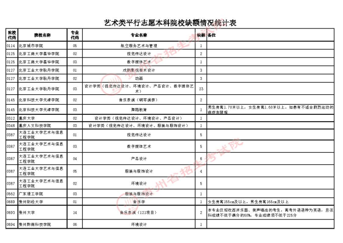 艺术类平行志愿本科院校投档后,部分院校因生源不足,尚有缺额,现进行网上补报。考生可根据缺额情况,及时补报志愿。本次网上补报志愿设置8个平行志愿,每个志愿设置3个专业,网上补报志愿时间为7月19日23:00至7月20日12:00。
