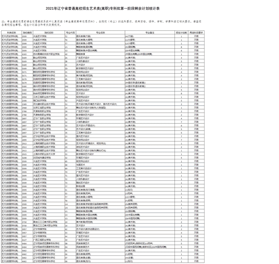 2021辽宁艺术类专科第一阶段剩余计划公布 时间:2021-07-30 09:15 招生计划 2021辽宁艺术类专科第一阶段剩余计划已经公布,小编整理了相关信息,来看一下!辽宁艺术类专科第一阶段剩余计划