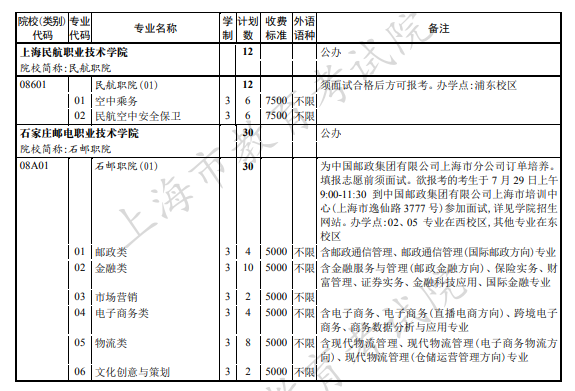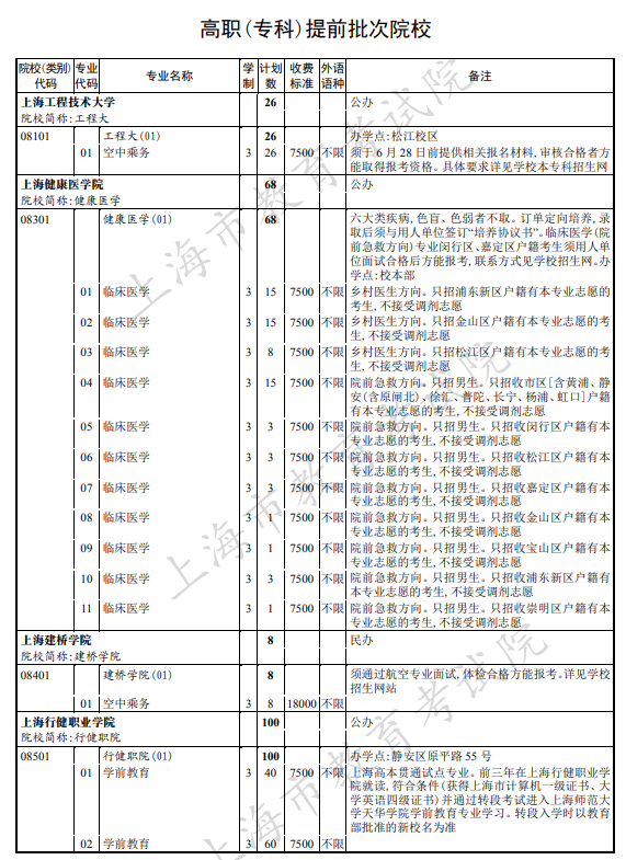 2021年上海市普通高校招生高职专科提前批招生计划 时间:2021-08-02 09:38 招生计划 2021年上海市普通高校招生专科志愿填报将于8月3日至4日进行,下面是高职专科提前批的各院校招生计划汇总,欢迎大家查阅了解。高职专科提前批招生计划
