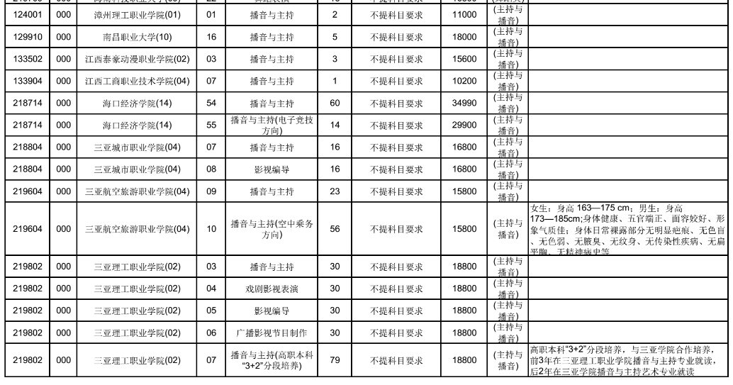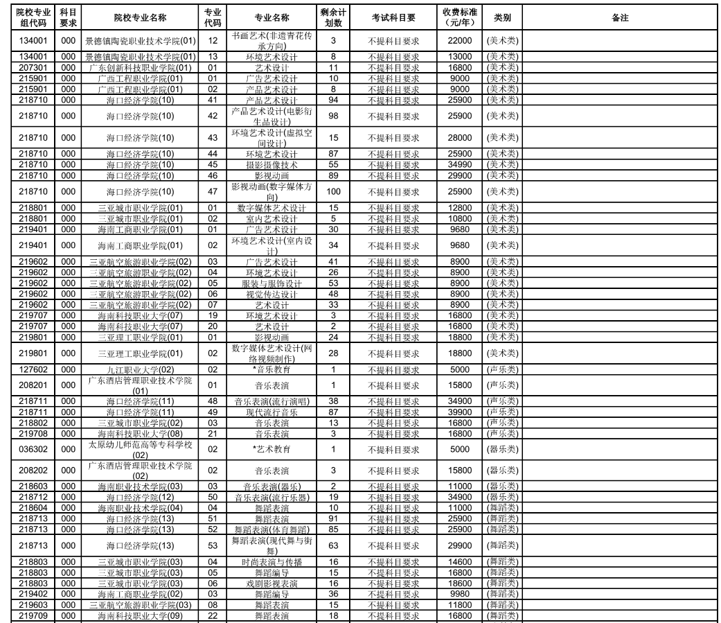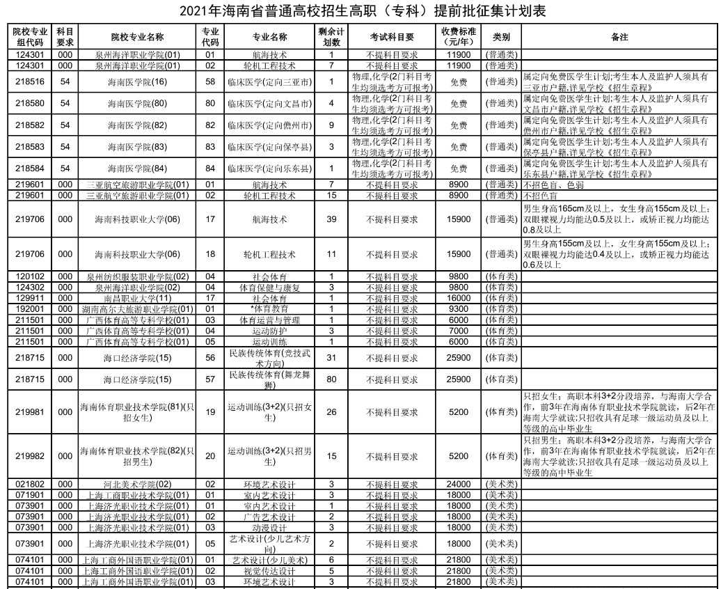 2021年海南省高职专科提前批征集志愿招生计划 时间:2021-08-05 11:50 招生计划 2021年海南省普通高校招生高职(专科)提前批(提前批普通类、艺术类、体育类)平行志愿征集志愿填报截至8月6日上午9点,下面是各院校的征集志愿招生计划,一起来看。高职专科提前批征集计划