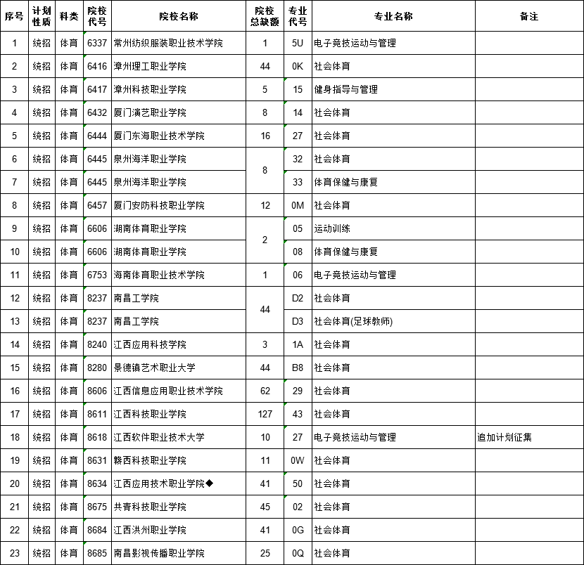 2021江西高考专科体育类平行志愿征集计划(第一次) 时间:2021-08-07 10:30 招生计划 征集志愿时间为:2021年8月7日9时--15时。填报缺额院校志愿时间截止后,未参加填报或未确认提交的考生视为自愿放弃本批次征集志愿填报机会。2021江西高考专科体育类平行志愿征集计划(第一次)