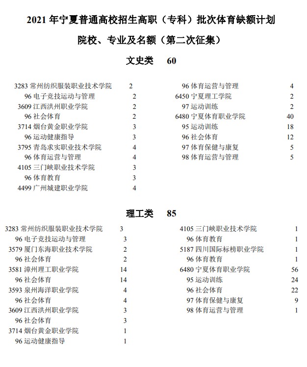 2021年宁夏高考专科批体育类院校征集志愿计划(第二次) 时间:2021-08-07 21:47 招生计划 2021年宁夏高考专科批体育类院校第二次征集志愿时间为:8月7日17:00时起至8月8日10:00时止。2021年宁夏高考专科批体育类院校征集志愿计划(第二次)