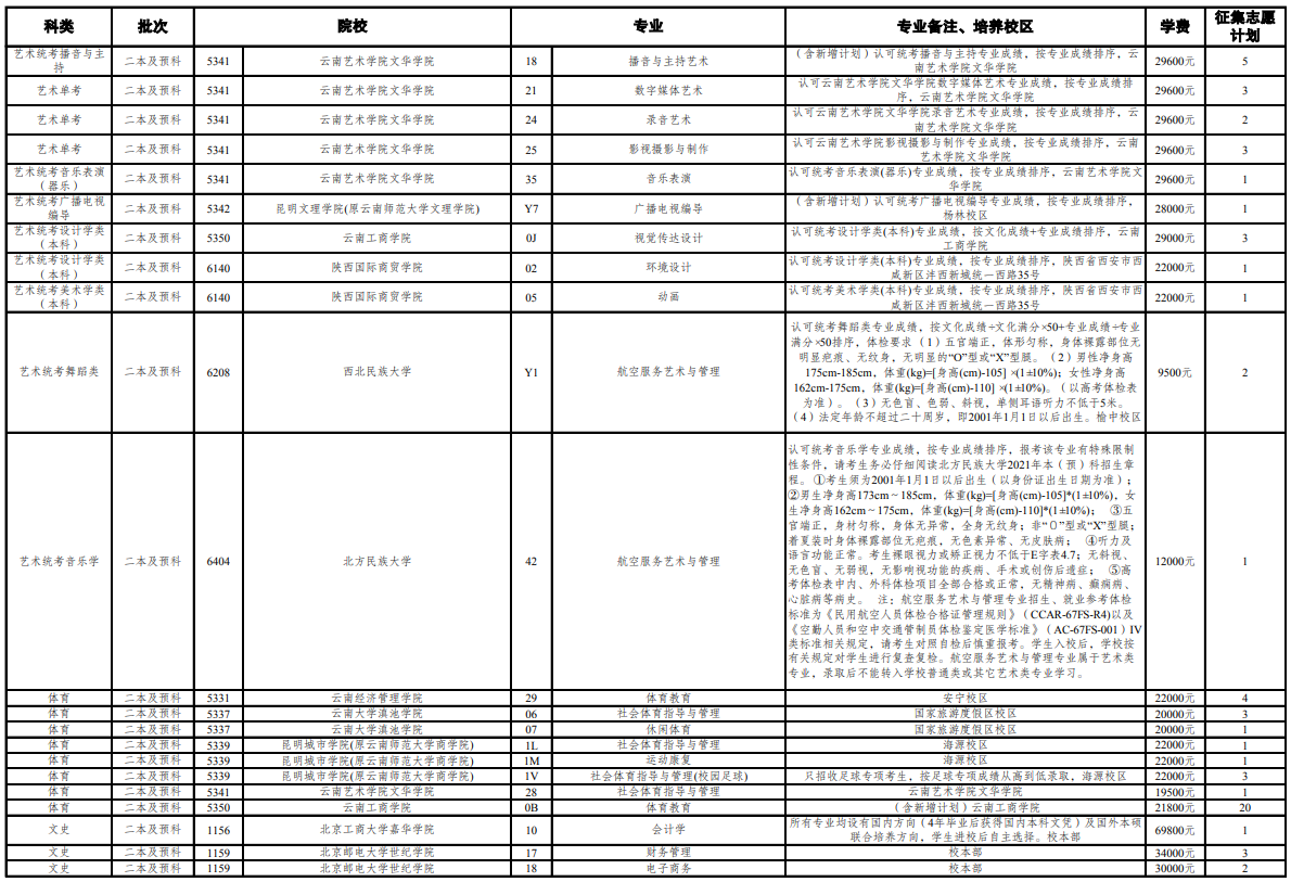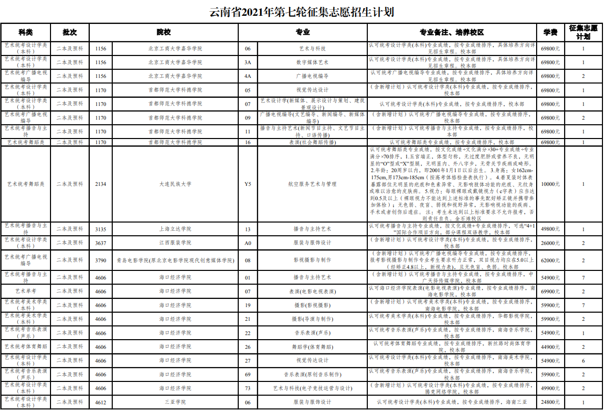 云南2021年普通高校招生第七轮征集志愿招生计划