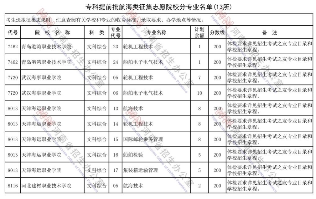 河南省2021年专科提前批航海类征集志愿招生计划 时间:2021-08-11 11:39 招生计划 2021年河南省专科提前批的航海类院校征集志愿招生计划已经公布了,下面是各院校的征集计划汇总,供大家查阅了解。专科提前批航海类征集计划