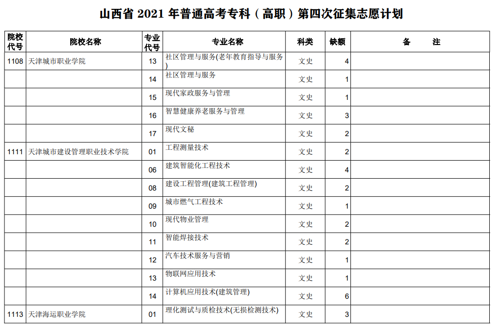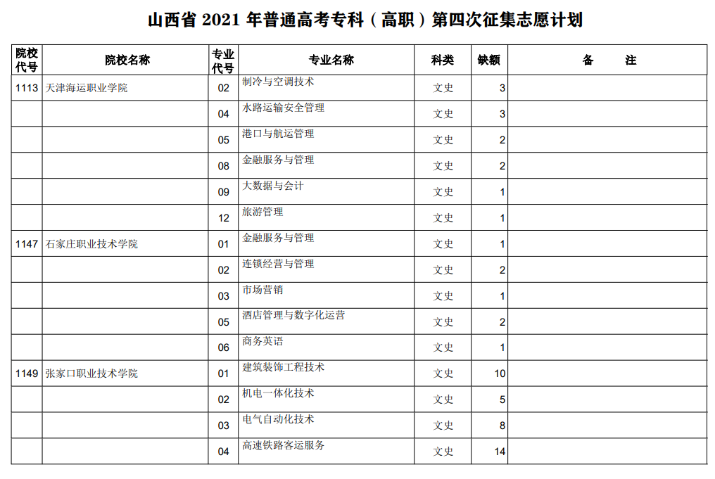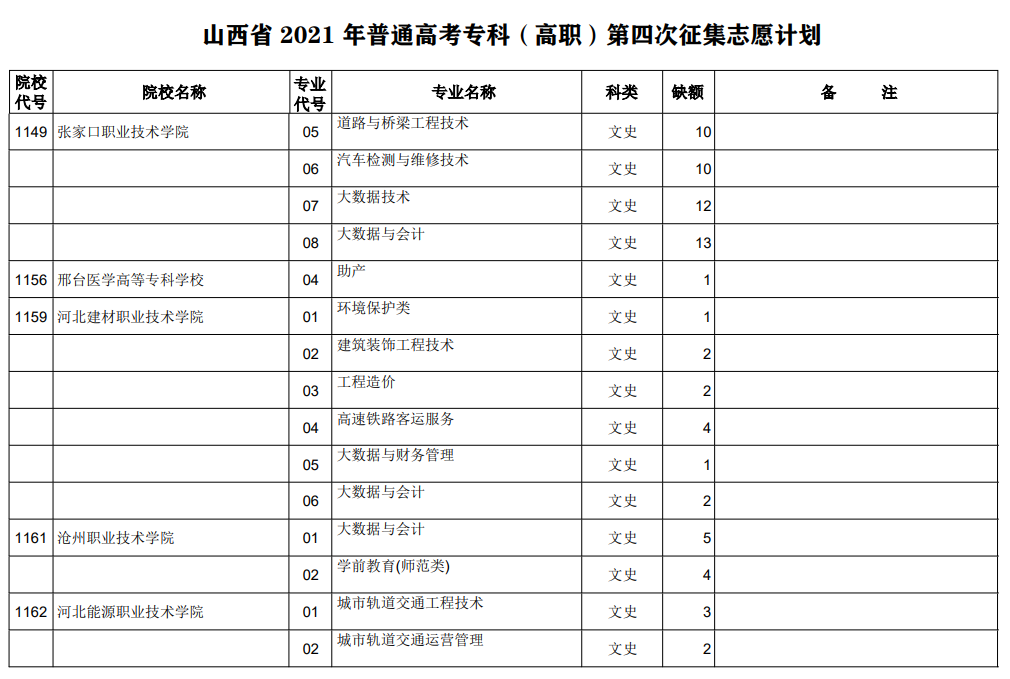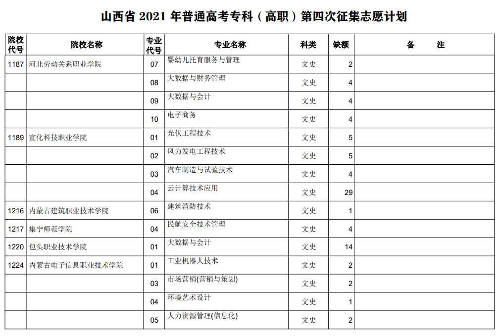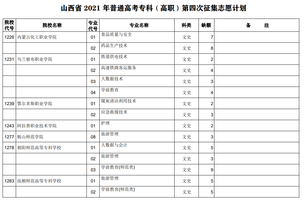 山西省2021年专科最后一次征集志愿招生计划(文史类)