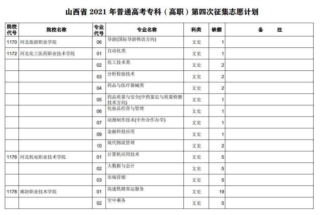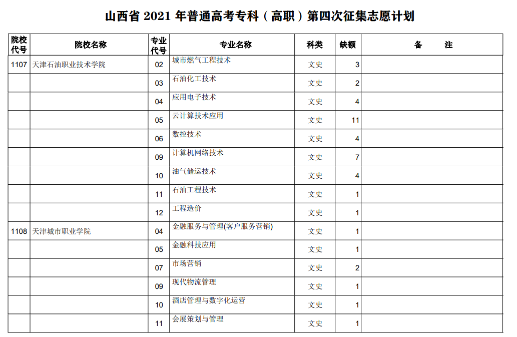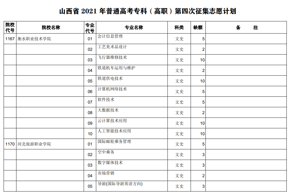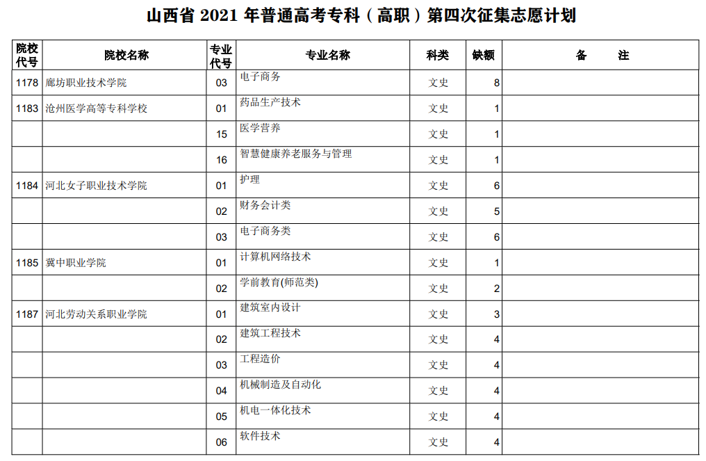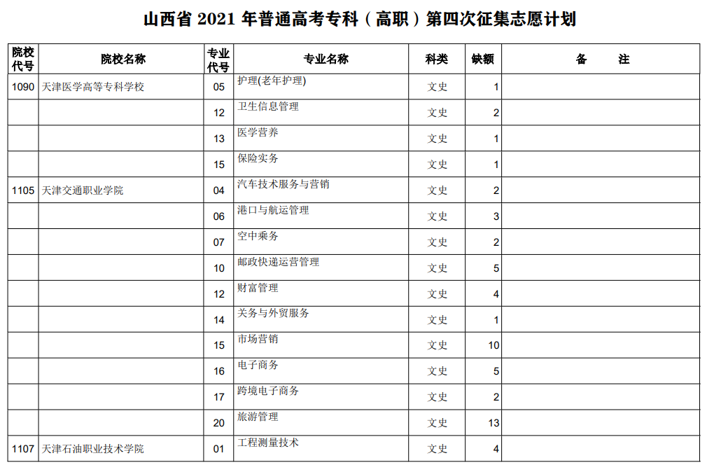 山西省2021年专科最后一次征集志愿招生计划(文史类)