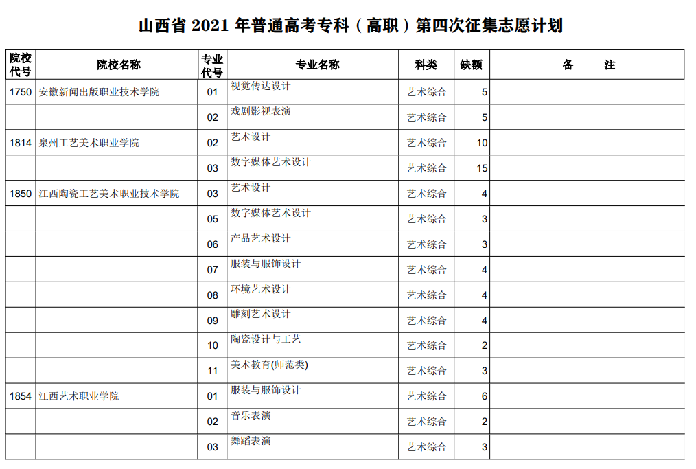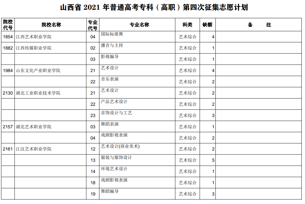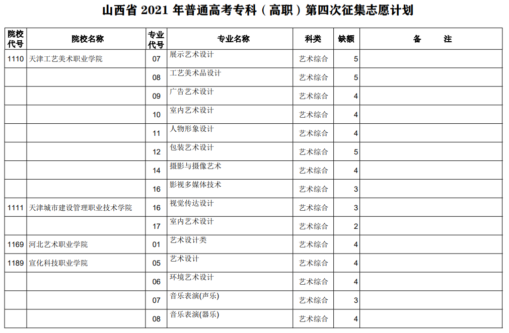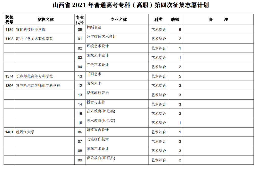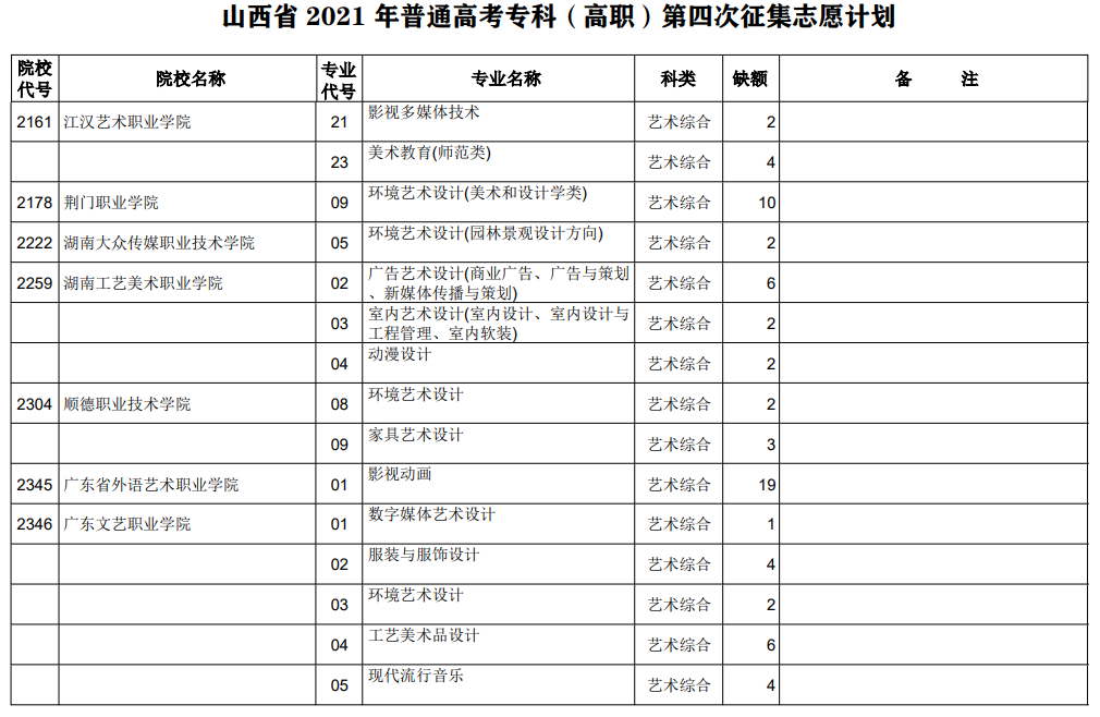 山西省2021年专科最后一次征集志愿招生计划(艺术类)