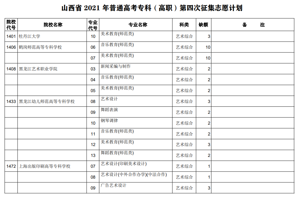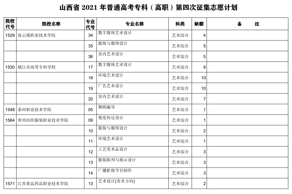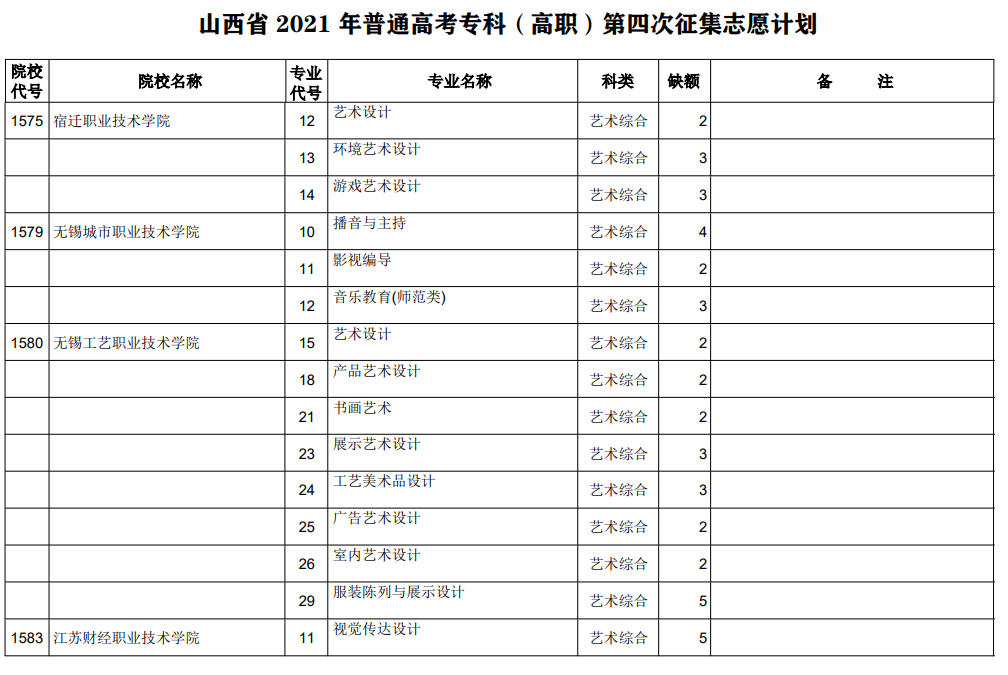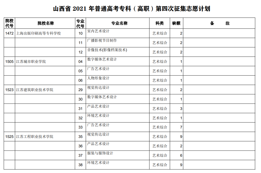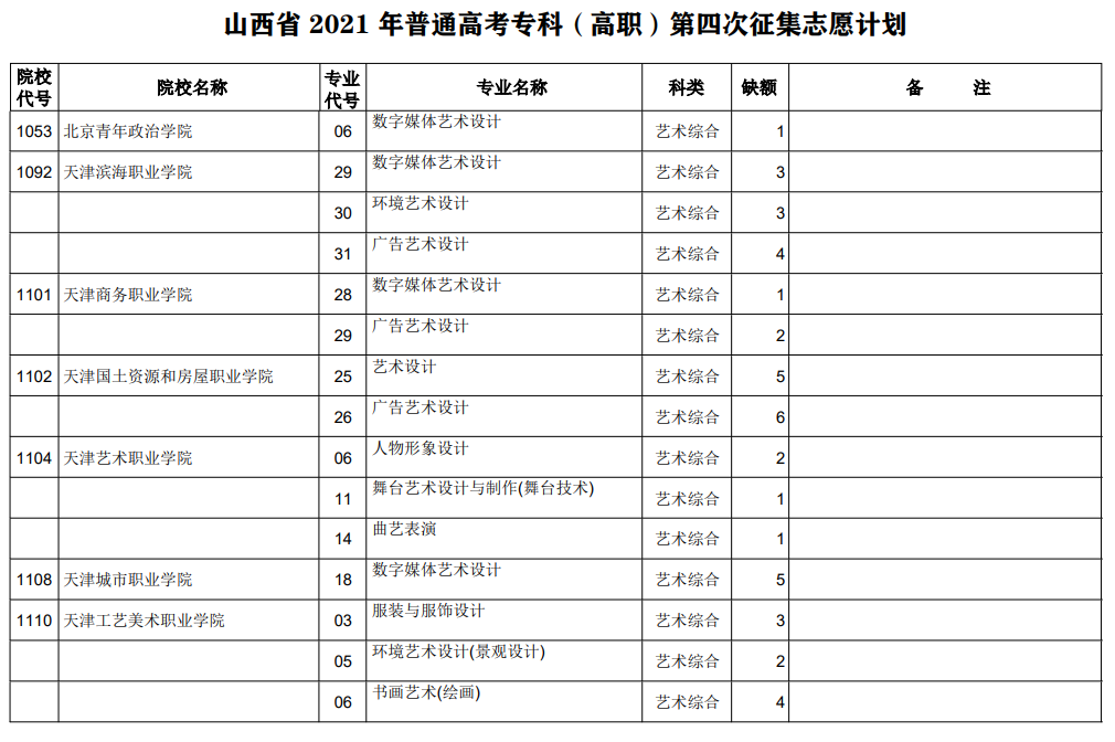 山西省2021年专科最后一次征集志愿招生计划(艺术类)
