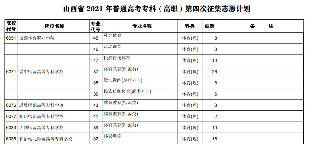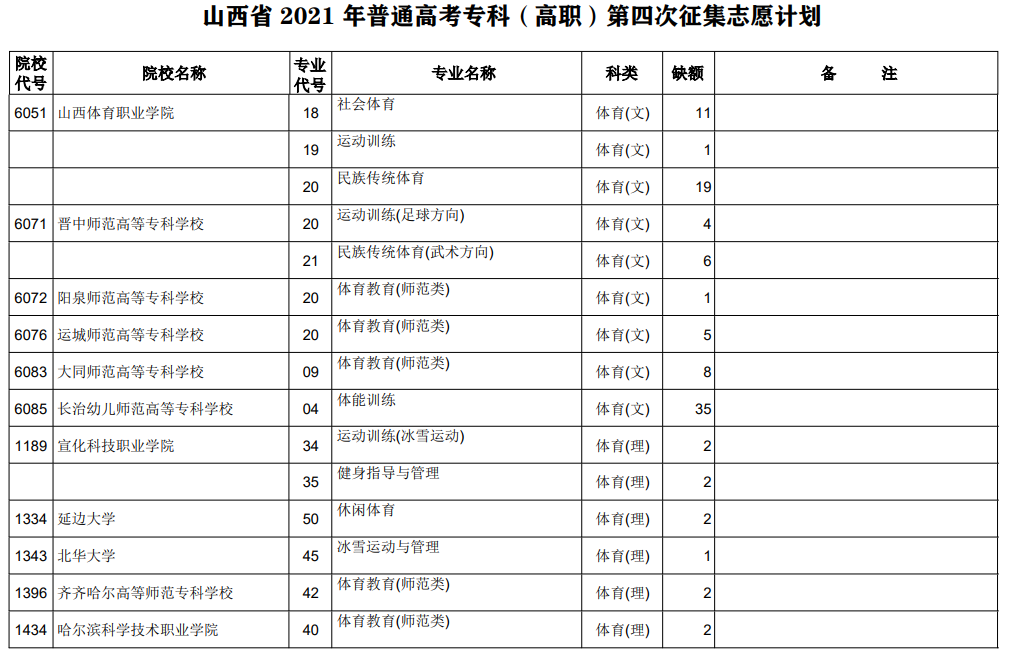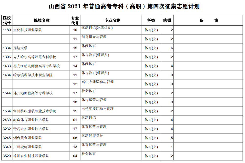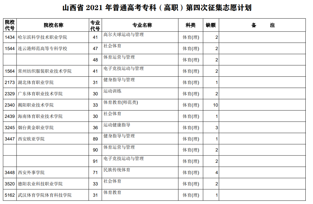 山西省2021年专科最后一次征集志愿招生计划(体育类) 时间:2021-08-22 17:16 招生计划 2021年山西省专科院校最后一次征集志愿时间为8月22日16:30—23日15:00,逾期不予受理。下面是各院校的体育类征集志愿招生计划,一起来看吧!专科最后一次征集志愿招生计划