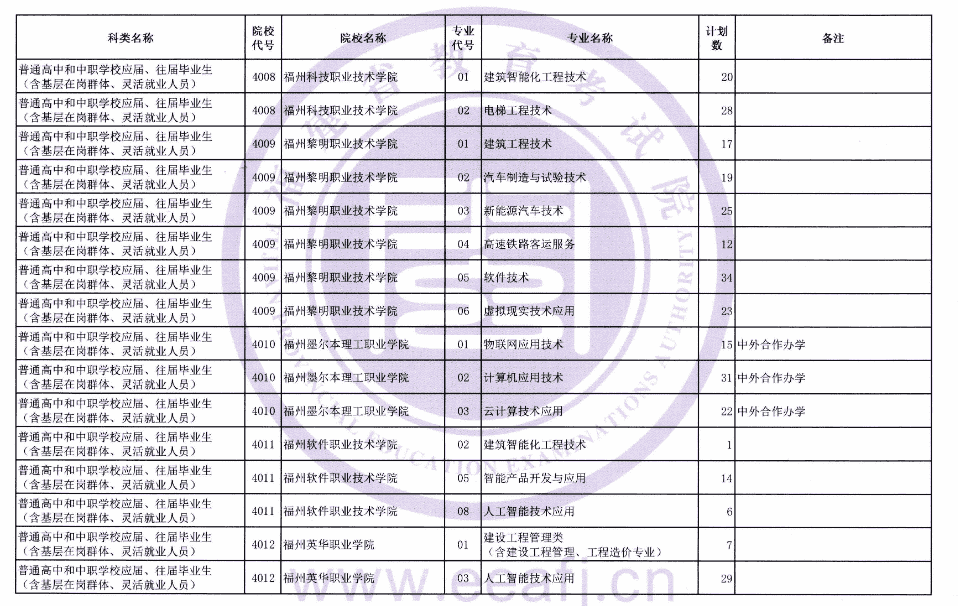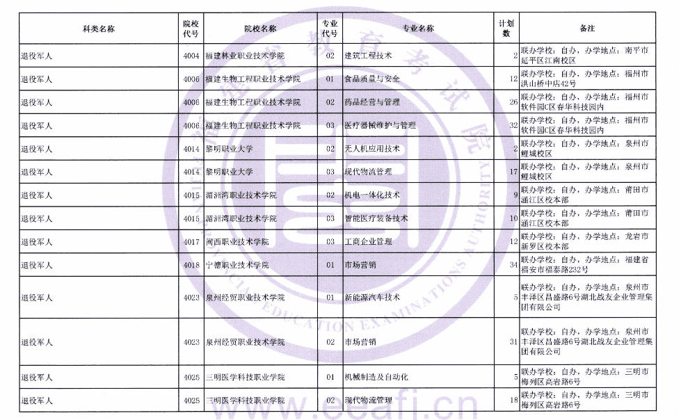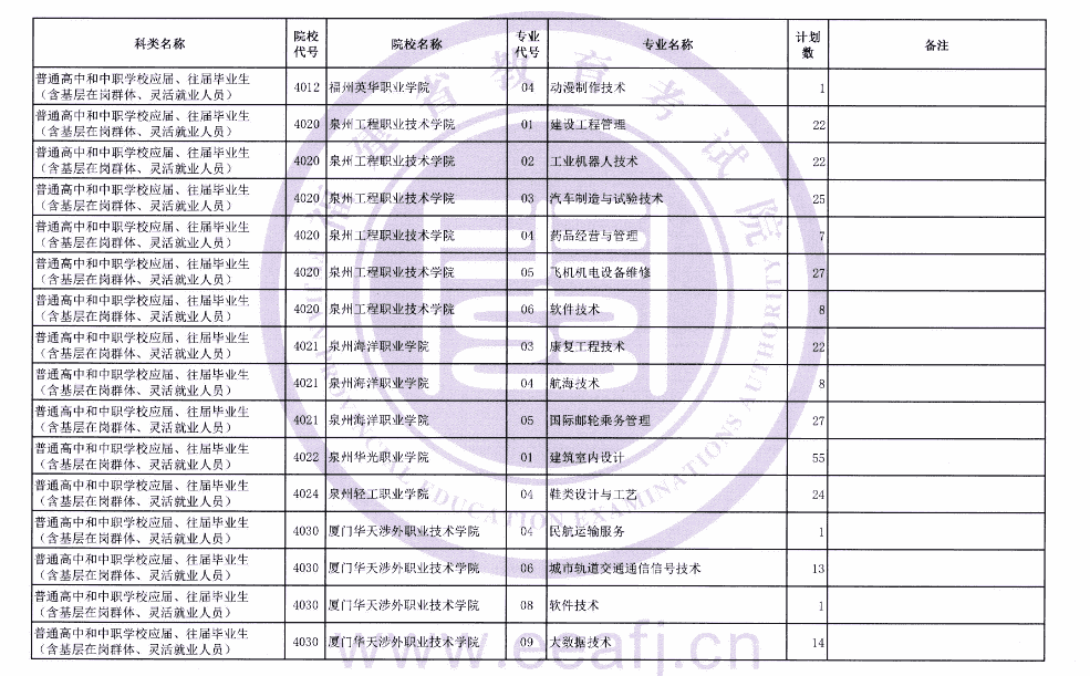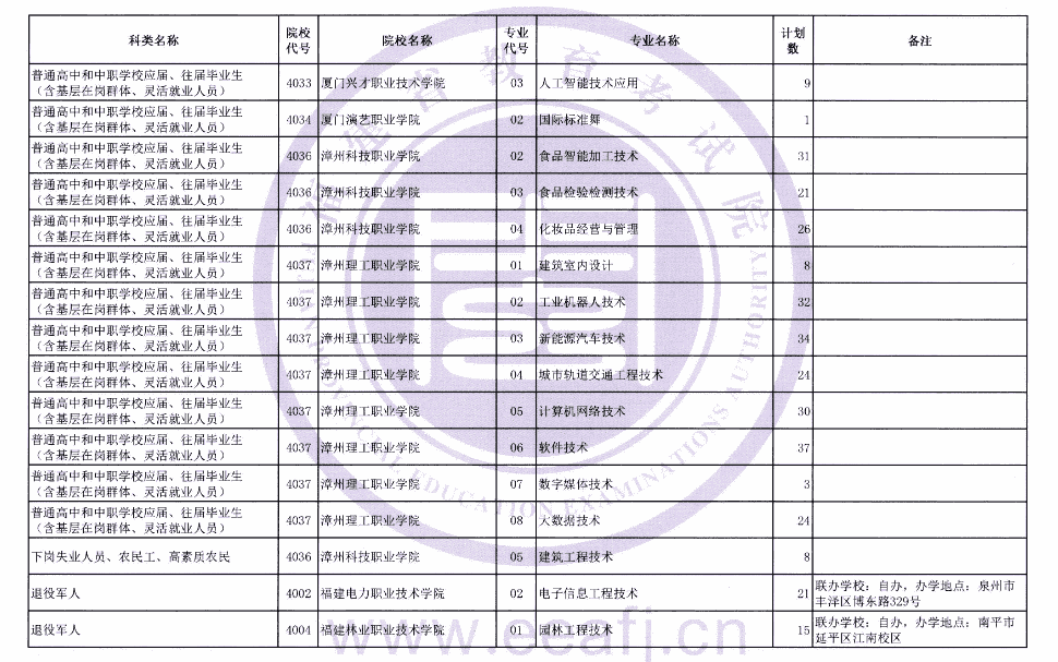2021年福建省高职扩招专项考试征求志愿招生计划 时间:2021-11-09 11:24 招生计划 福建省2021年高职扩招的征集志愿填报时间为11月12 日8时至 18时,下面是各院校的征集计划,一起来看吧!福建省高职扩招征求志愿计划