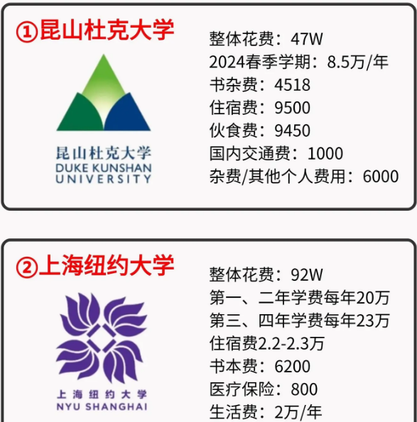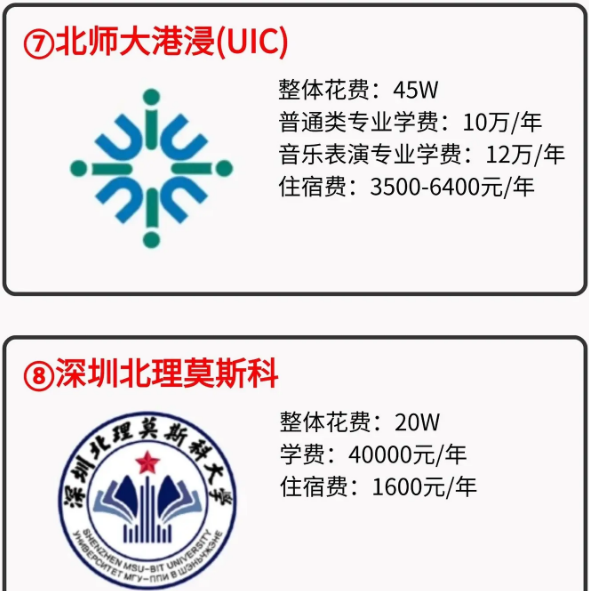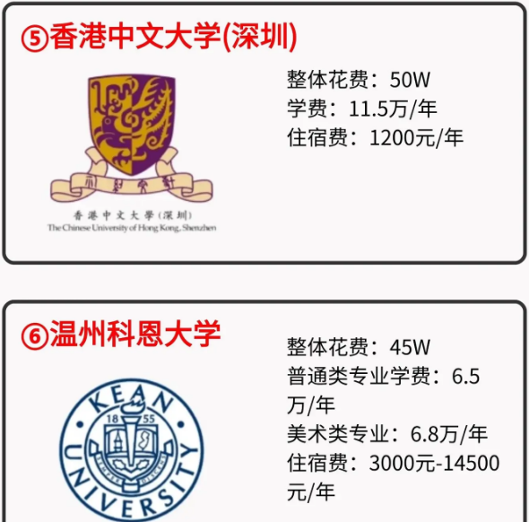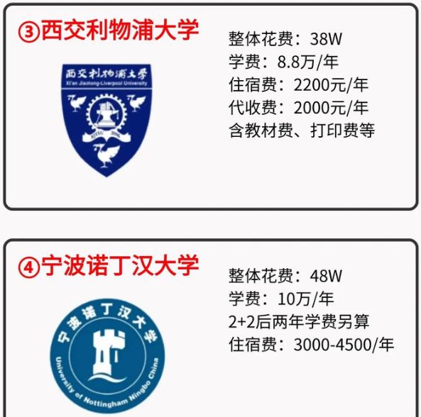 深北漠整体花费:20W。西浦4+0整体花费:38W。UIC整体花费:45W。温肯整体花费:45W。港科大整体花费:45W。昆杜整体花费:¥47W。宁诺整体花费:48W。广以整体花费:48W。港中文整体花费:50W。西浦2+2整体花费:90W。上纽整体花费:92W。