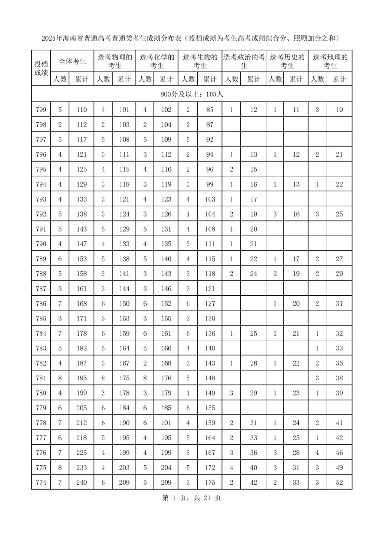 小编整理的2025海南高考一分一段表及位次排名对应大学内容,供2026考生参考,主要数据如下:800分及以上有105人,700分及以上达1763人,600分以上约1.2万人,而本科线480分对应位次为43089名。一分一段表是以"1分"为单位统计的考生成绩分布表,包含三个关键信息:分数、本段人数(考得该分数的考生人数)和累计人数(该分数及以上分数的总人数)。
