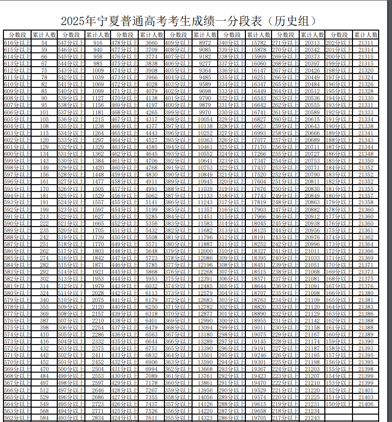 宁夏2025年高考一分一段表已经完整发布,包含历史组和物理组的详细数据。以历史组为例,616分以上考生有54人,547分以上916人,478分以上3660人,409分以上8972人,340分以上15782人。物理组数据显示,641分以上104人,570分以上1656人,499分以上7300人,428分以上18721人。